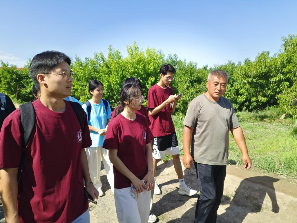 赴新疆团场“弘扬兵团精神·传承红色基因”暑期社会实践队来到位于新疆生产建设兵团八师一四三团九连的倪家桃园进行参观,了解兵团基层组织建设、发展特色农业、促进兵地融合发展等情况。