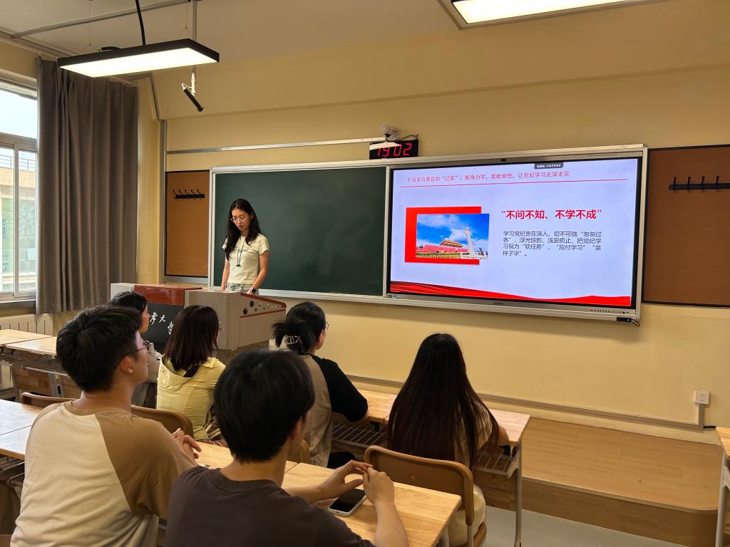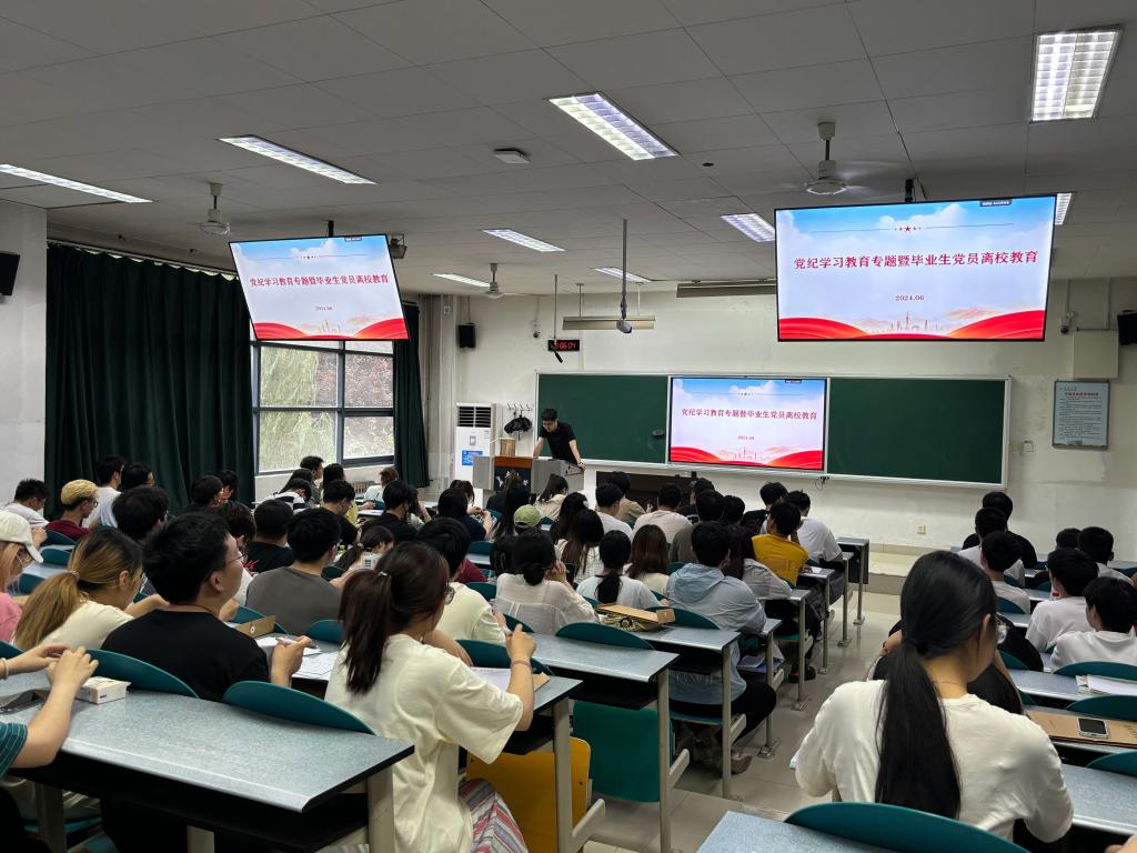 委员会开展党纪学习教育的实施方案》,对各级党组织和党员的学习内容、学习方式进行明确要求,切实抓好理论武装;以毕业生党员为主体,通过“年级大会、支部大会、支部书记讲党课”等多种形式上好一节党纪学习教育党课,坚定前行信念;将过好一次“政治生日”、重温入党誓词等作为毕业生党员教育的重要载体,强化党员身份意识,永葆政治本色。