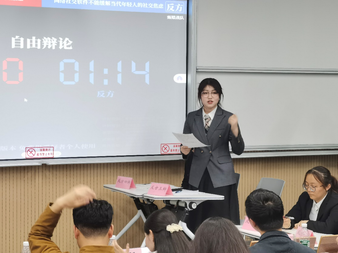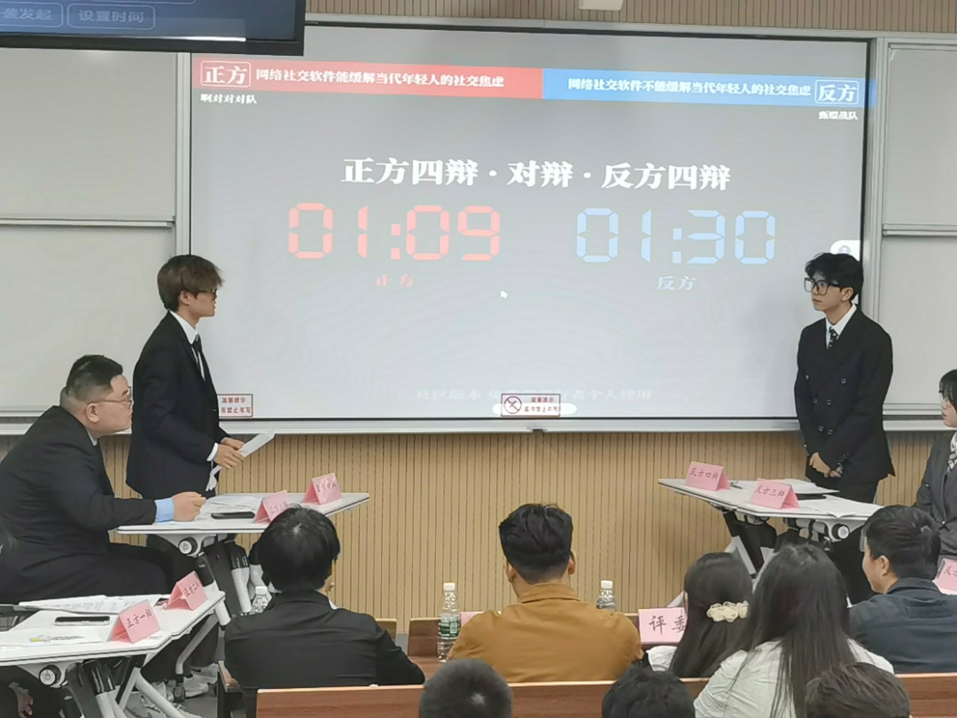 正反双方围绕“网络社交软件能/不能缓解当代年轻人的社交焦虑”辩题展开辩论。辩论中,双方你来我往唇枪舌战。立论环节正方先声夺人,反方针锋相对;攻辩环节,双方各自抓住对方立论的漏洞,质疑发难,攻守有道;自由辩论中,正反双方更是针锋相对,妙语连连;最后的总结陈词环节双方四辩或冷静理性,或温暖感性,将辩论再次推向高潮。整场辩论赛辩手们或纵横捭阖,古今中外无所不包,或大处着眼小处深论,机智幽默巧借概念,在一次次思维的交锋碰撞中共同为真理而辩,为青春喝彩,引得台下观众掌声连连,叫好不断。