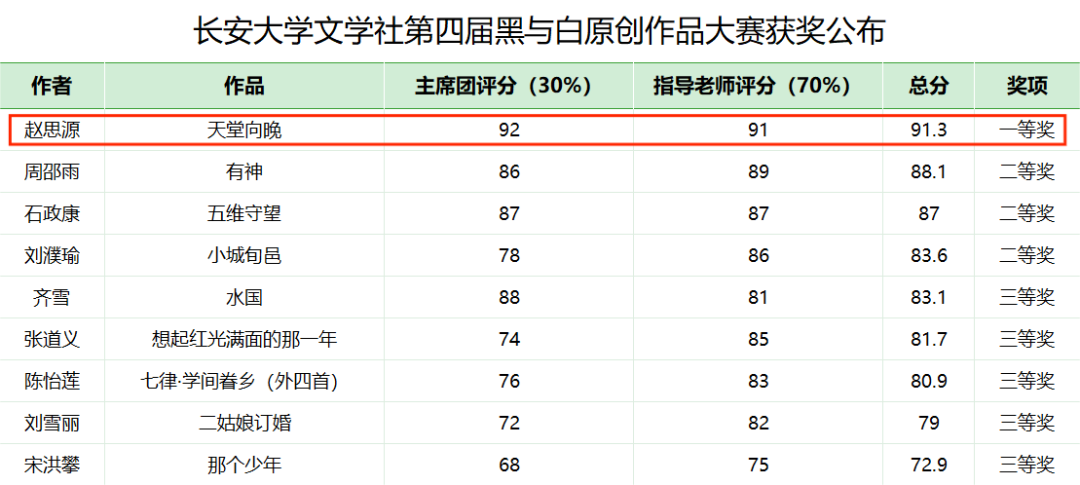 文学社第四届黑与白征文比赛全校一等奖(总分第一名),成为该比赛自举办以来唯一一人蝉联冠军。