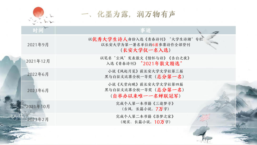 然而,在日复一日的思考、感悟中,他逐渐意识到——奖项只能代表个人的荣誉,并不完全能够为学校,为社会,为时代带来真正卓越的贡献。于是,他做了一个相当大胆的决定——从琳琅满目的活动与比赛中抽身,潜身于更深刻的创作中,心怀文学,为时代着墨。这一写,就是三年:他成功在大学期间独立撰写了两本纯文学书籍《三途梦寻》《涤梦之家》,共计17万字。目前的他正在联系画师与出版社,准备举办自己的新书发布会,为早日加入中国作家协会而不懈奋斗(省作协成员申请要求为发表15W字和出版纸质书籍1本,即将满足),让长安也能以今后的自己为荣。