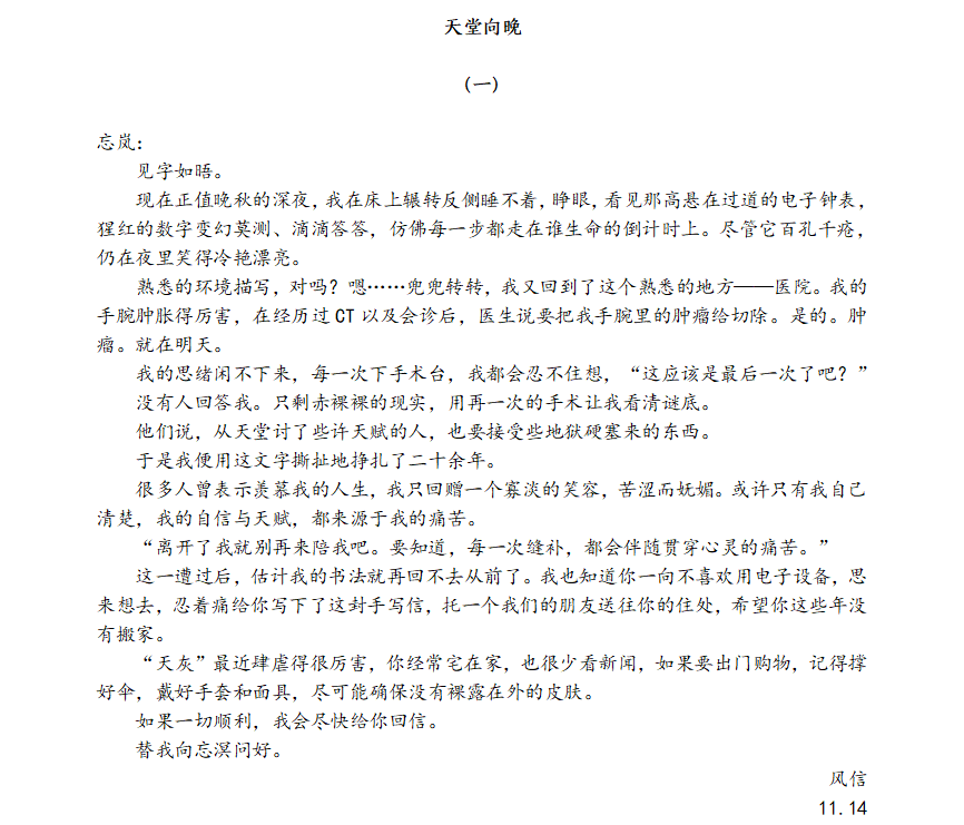 文学社第三届黑与白征文比赛全校一等奖(总分第一名),2023年6月,他的小说《天堂向晚》荣获91麻豆