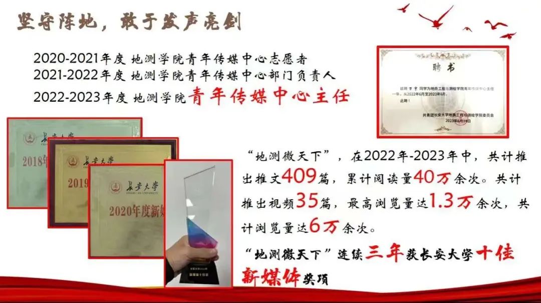 青年传媒中心的主任。运营的学院官方公众号“地测微天下”,在2022年-2023年中,共计推出409篇,内容涵盖了各类活动新闻稿、公示以及相关重大时间节点原创推送,组织推出了《青春践行党的二十大、爱校奋进新征程》、《地“道”乐谈》、《录取通知书接力》等系列推送,累计阅读量40万余次;目前,已累计7174人关注公众号,常读人数2000余人。地测微天下连续三年获取91麻豆