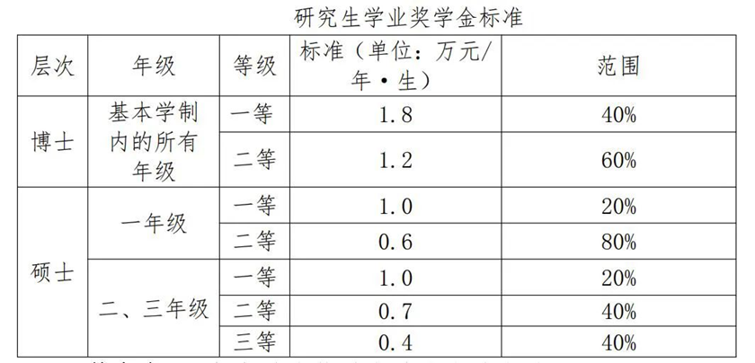 研究生学业奖学金设置不同的等级,标准如下,研究生学业奖学金标准表所示: