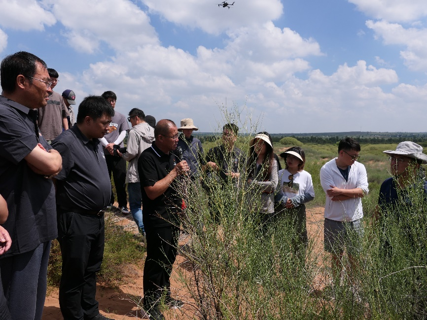 随后,科考队前往新街治沙站阿鲁图作业区。治沙站站长白增亮对伊金霍洛旗境内裸露沙地治理情况、草原生态修复治理等情况进行详细介绍。20世纪五六十年代,新街治沙站管辖范围森林覆盖率不足8.9%,植被覆盖率不到35%,出现了沙进人退的严峻局面。2016年,白增亮接任治沙站长带领广大治沙人逐年进行了植被恢复残次林改造项目。在一代一代治沙人的努力下,据国有林地二类资源统计数据,2020年新街治沙站林业用地增加到28.96万亩,森林蓄积量达9.27万立方米,森林覆盖率为82.91%,昔日荒漠变成了绿洲。