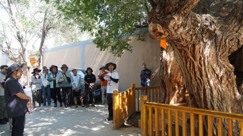 暑期社会实践队第二站参观了化隆八景之一的空心古榆树。古树直径约2.1米,高约10米,虽800多岁仍根深叶茂。因树心中空,故常有村民和游客在树中饮茶作乐。暑期社会实践队第三站来到了位于村北部的阿河滩清真寺。阿河滩清真寺始建于公元1323年(元代末期),既是阿河滩村历史变迁的见证者,又是撒拉族多元文化体系的实证文物,具有很高的历史价值和艺术价值,是全国第七批重点文物保护单位。在这里暑期社会实践队与同行的游客一起体验到了集藏式建筑、汉式建筑、伊斯兰艺术于一体的四合院式建筑。从与游客、村民的充分交谈中,暑期社会实践队队员切实感受到了地质文化村建设从文化产业方面赋能乡村振兴,深入推进与服务产业融合延长产业链,因地制宜发展乡村特色产业,实现美丽乡村高质量发展。