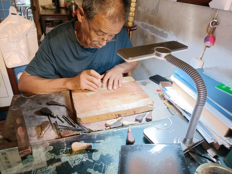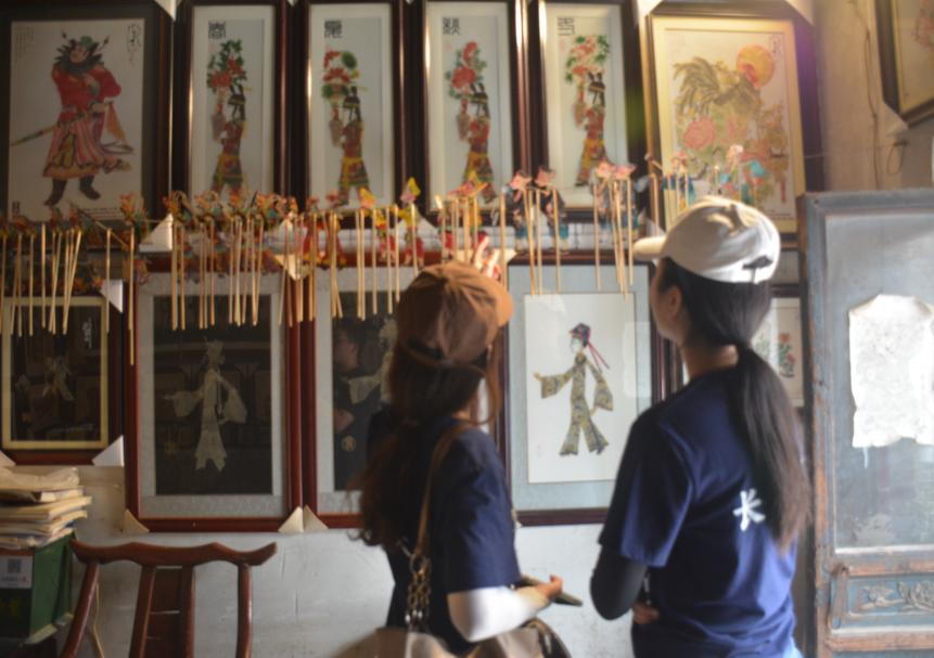 实践队还了解到皮影在选材、工具使用、制作方面也尤为讲究,皮影的制作大多选用牛皮作为原材料,制作一套皮影需要花费2~3天的时间,因此精美细致的皮影的制成凝结着匠人们丰富的智慧。在访谈中,当谈及皮影戏发展现状与继承的时候,张师傅遗憾的说到:“现在的皮影跟以往不同了,现在都没人学。” 这句话道出了目前皮影的传承与发展面临困难,还有皮影制作传承的问题,“很多制作皮影的手艺都失传了,做这些皮影的人也很少”。张师傅一边说,一边向实践队员展示夹在厚纸板里的宝贵的皮影,“他这原来还有很多人做,现在做的这些很多都成纪念皮影,这种已经做不动了”。接着,在访谈后团队成员参观了皮影坊,看着墙上陈列的一个个生动且精美的皮影,都蕴含着手工匠人对皮影的热爱。