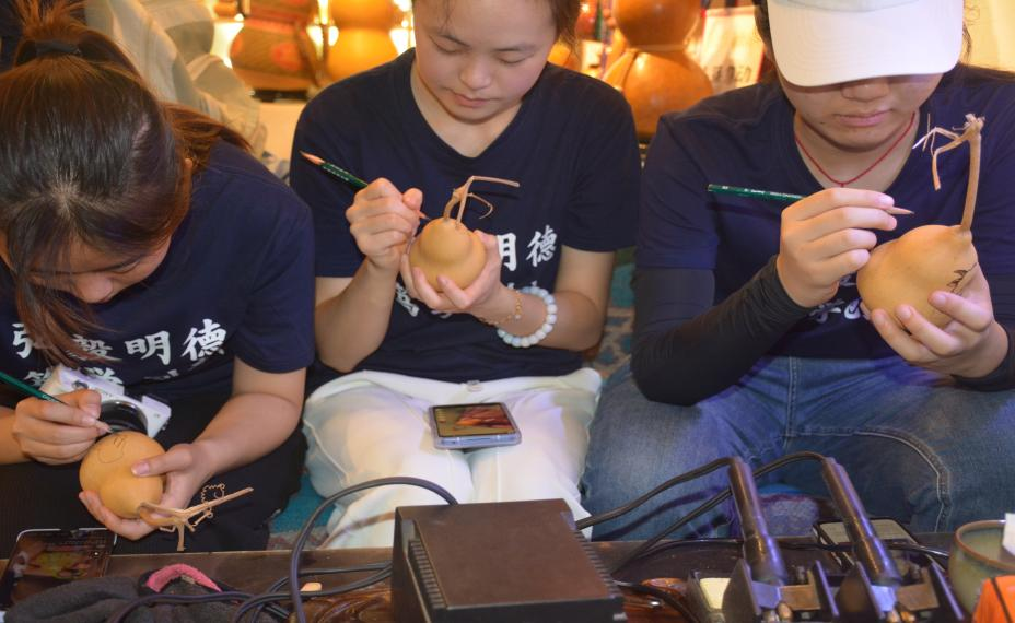 调研完皮影戏后,实践队又来到了当地葫芦坊进行走访调查。葫芦画是一种古老的传统工艺美术品。在葫芦上刻画和装饰的艺术称为“葫艺”。实践团队来到袁家村“葫芦坊”,通过采访葫芦坊老板,队员们了解到在葫芦上赋诗作画、进行艺术创作能表达富贵平安、福寿绵延、多子多福等美好祝愿。实践队员还在师傅的指导下,亲自体验在葫芦上绘画,深深感受到了葫芦画艺术的乐趣。