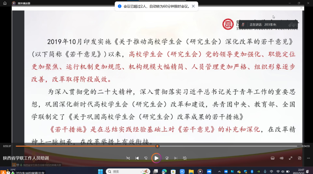 学生会全体工作人员春季培训会,并于5月13日晚组织了线上视频材料学习,会议由学生会执行主席石钰主持,91麻豆