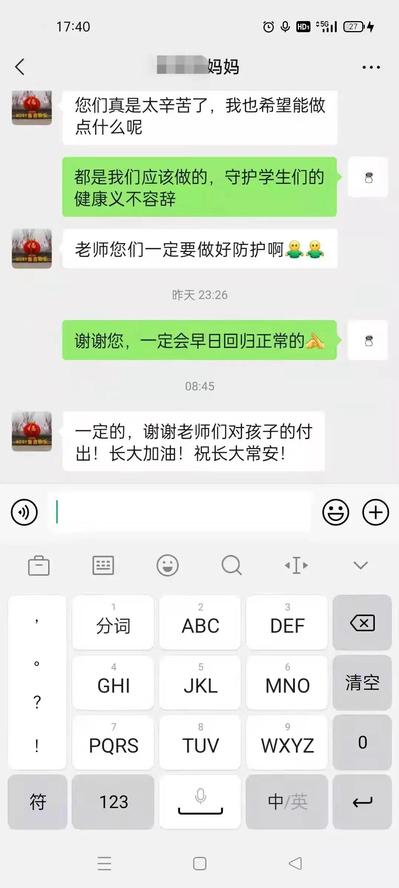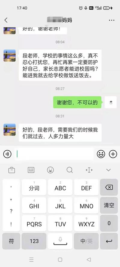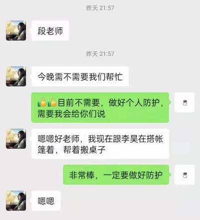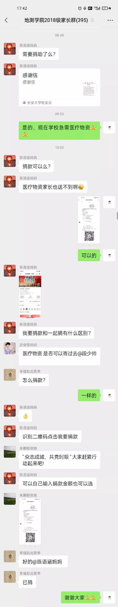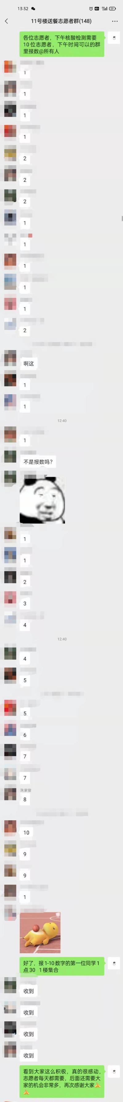 当然,我们的学生制动在宿舍也很棒,一个个门口上的卡片让所有人都感动,好养活、不挑食、志愿者辛苦了、全员志愿者,饭放门口等等。除了学生,学校的疫情也牵动着家长们的心,家长们在群里相互加油打气,甚至有些家长问需不需要志愿者,他们能不能做点什么?在听闻今天学校缺防护物资,家长们积极行动起来,为学校疫情防控贡献自己的力量。