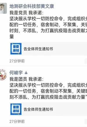 团委精心组织策划了“团心抗疫,共克时艰”的线上主题团日活动、《告全体师生通知书》线上主题学习、“疫情防控·团员发声”等系列活动,确保全员总动员,班团齐参与,为本次疫情防控贡献力量。