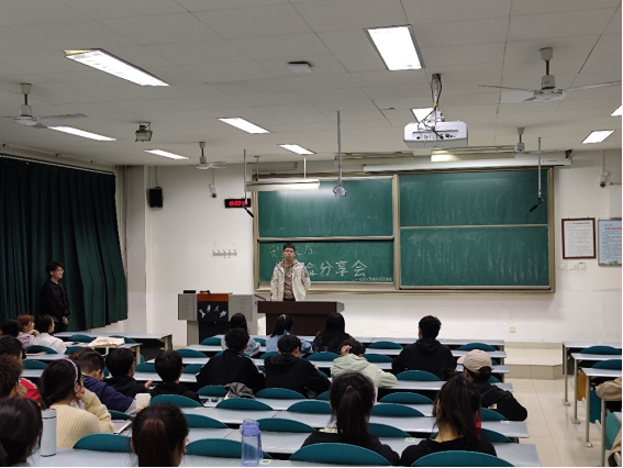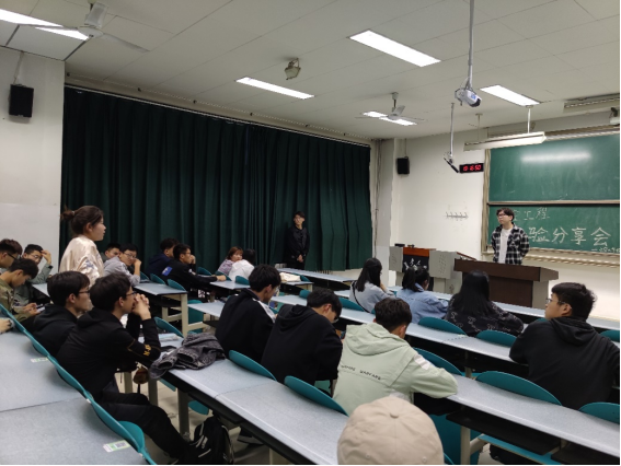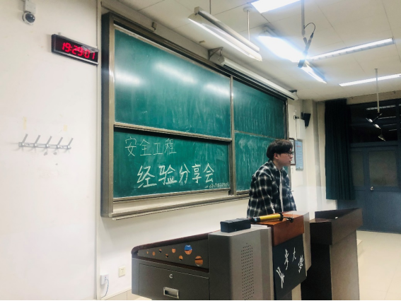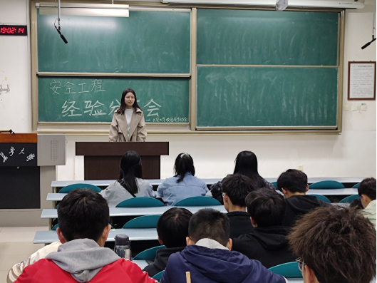 校园安全协会负责人王雷简要介绍了社团发展状况以及此次交流分享会邀请到的四位学长学姐。随后,先后由保研的夏婷学姐、以400多分的优异成绩考取我校安全工程专业硕士研究生的王明明学姐、何峻宇学长以及选择就业的程恩宇学长分别结合自身经历,向同学们讲述了不同道路的经历与经验。