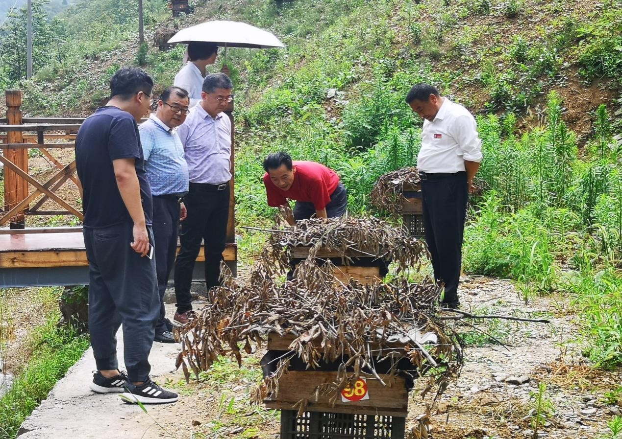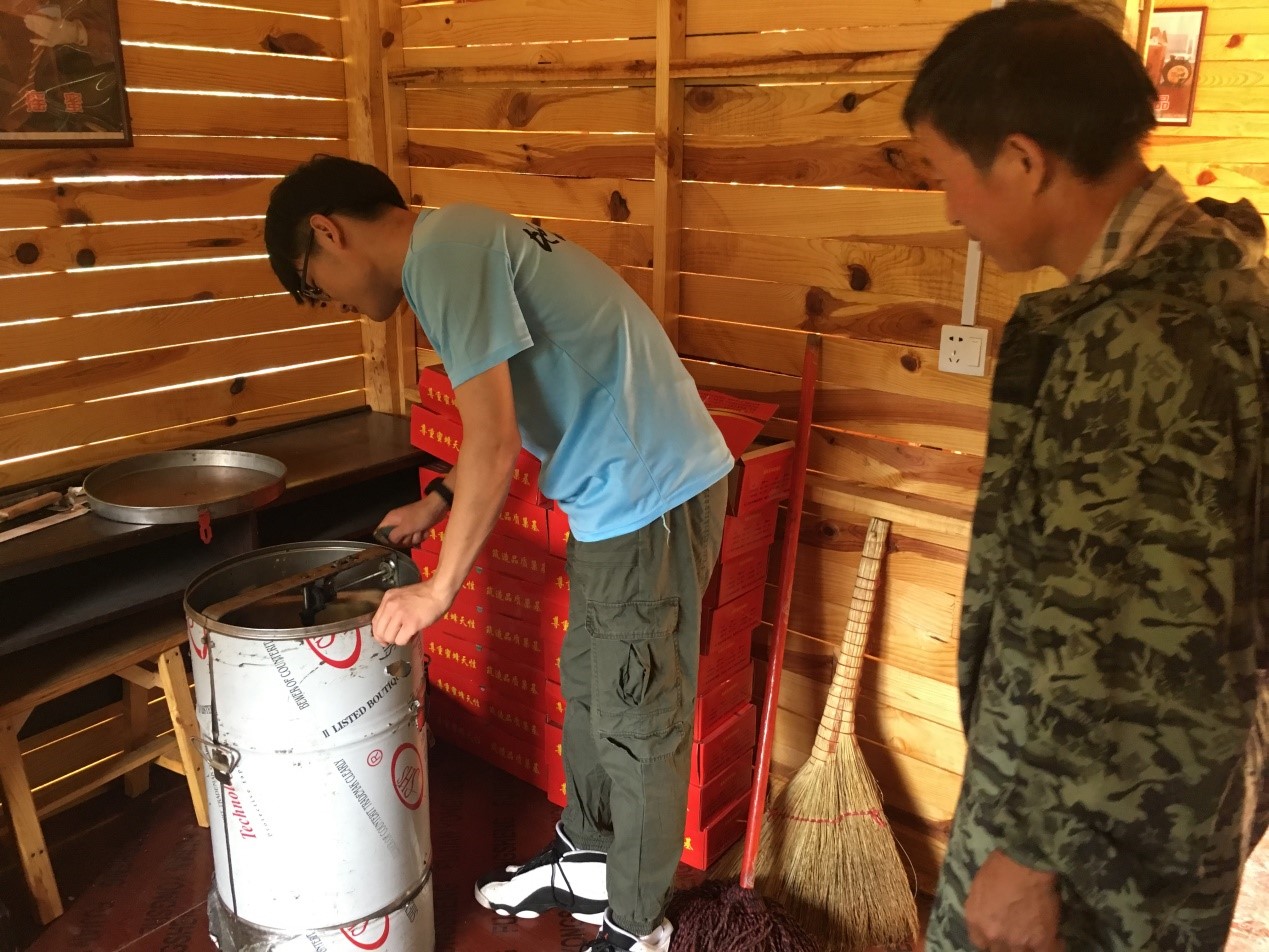 金丝峡镇二郎庙村曾经是陕南山区典型的贫困村,脱贫攻坚战打响之后,二郎庙村发生了天翻地覆的变化:基础设施步步到位,产业发展前景广阔,村容村貌焕然一新。二郎庙村紧抓“龙头企业+合作社+贫困户”的“三方联盟”精准脱贫模式,着力壮大村集体产业,带动群众增收致富。实践队一行人在村支部副书记王书晶的带领下,参观了二郎庙村蜂蜜、香菇、茶叶三大支柱产业,并对当地特色产业——中华蜂蜂蜜的生产加工等流程及产业情况进行了全面细致的调研。队员身着防护服,近距离来到蜂箱前,亲身体验了蜂蜜采集的全过程。二郎庙村年产蜂蜜可达3000斤,且供不应求,为村内带来了可观的经济收入,带动当地经济发展,将当地村民带上发家致富路。