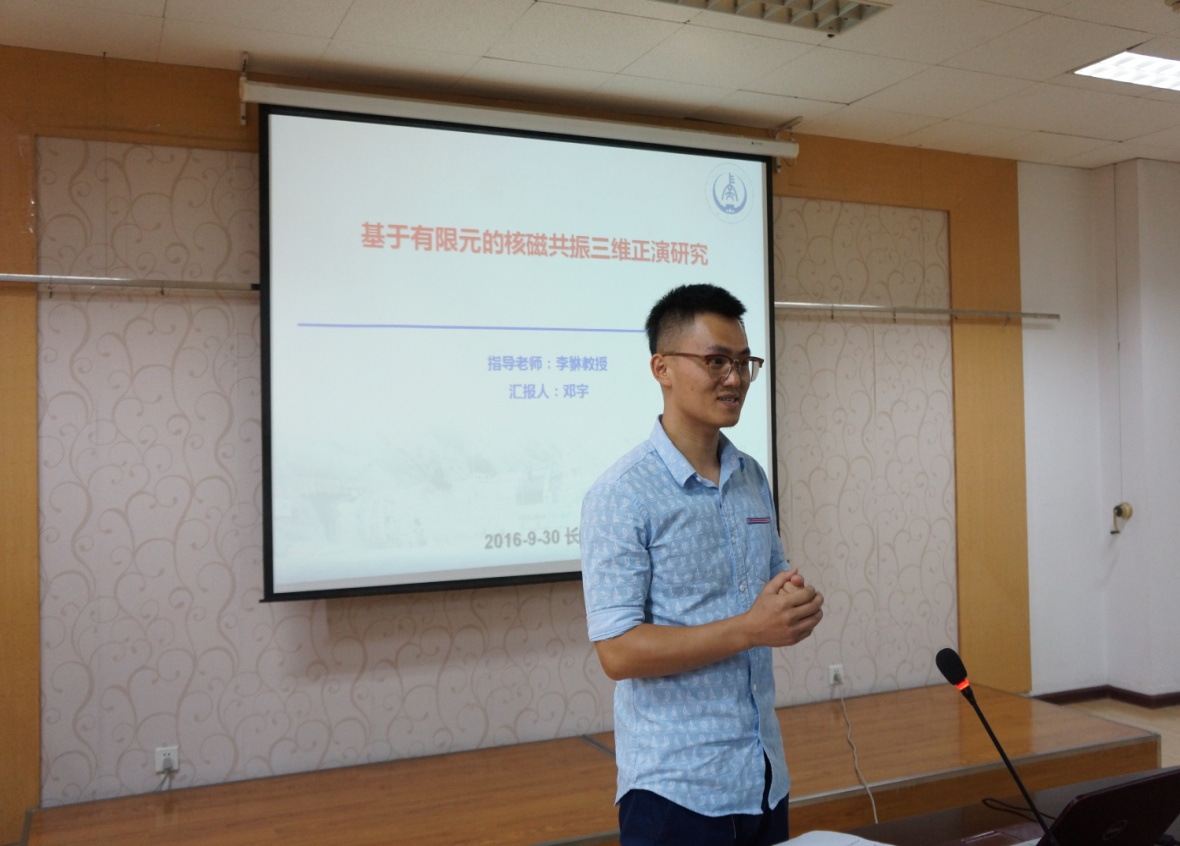 会上硕士研究生刘航、邓宇同学分别作了题为“瞬变电磁三维建模及软件开发”和“基于有限元的核磁共振三维正演研究”的学术报告。两位同学结合自己的所学所思,与大家分享了自己的学术成果和学术观点,理论丰富、观点新颖,获得了同学们的认可和掌声。现场交流、探讨十分热烈,学术氛围非常浓厚。