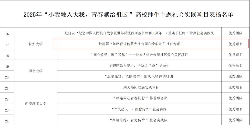 近日,在2025年陕西省“小我融入大我·青春献给祖国”主题社会实践优秀项目评选中,我院赴新疆“丝路育才传薪火·推普同心绘华章”暑期社会实践推普专项脱颖而出,荣获“优秀项目”称号!