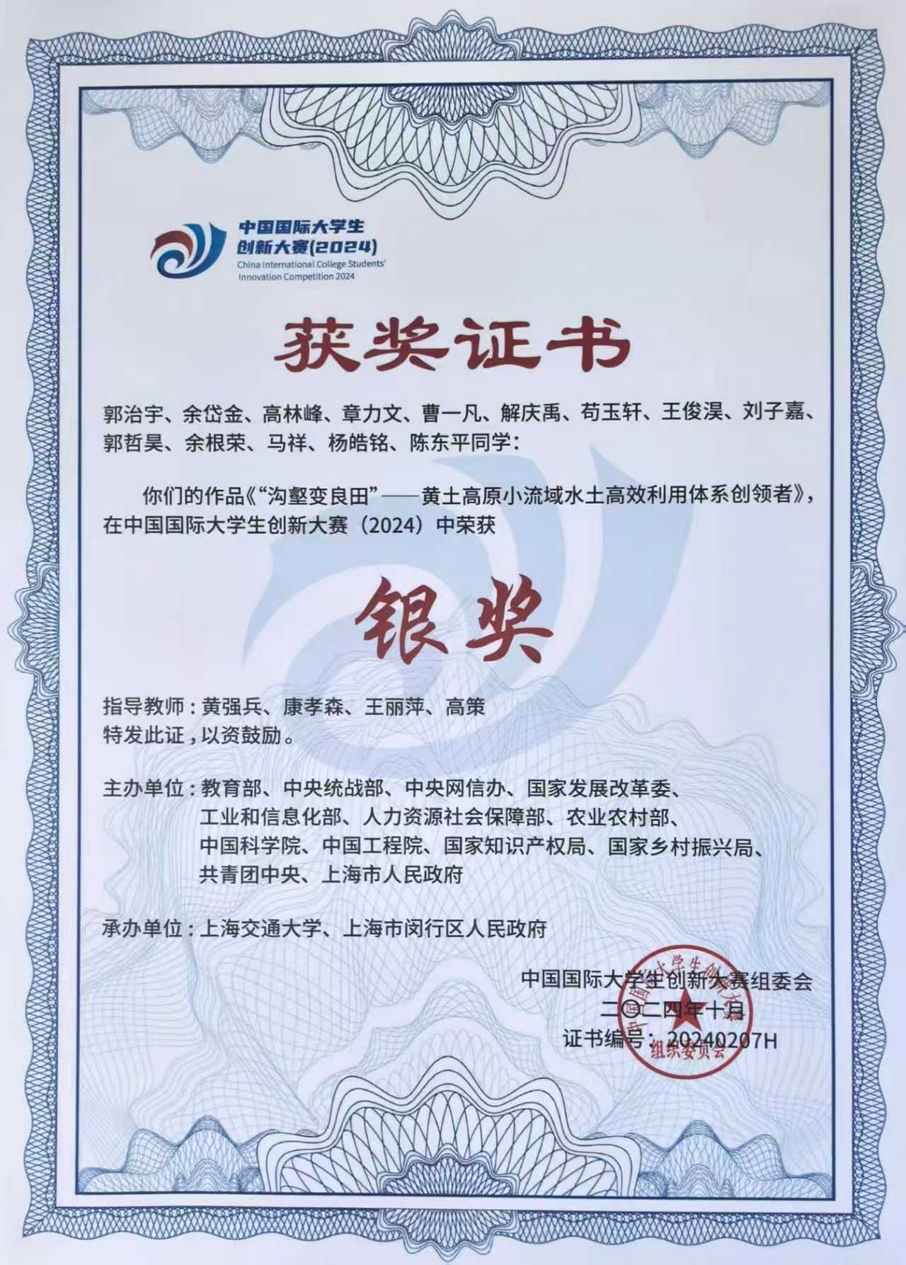在教育部、中央统战部、中央网信办等12个部门与上海市人民政府共同主办、上海交通大学承办的中国国际大学生创新大赛(2024)全国总决赛中,我院地质工程系学生团队凭借《沟壑变良田—黄土高原小流域水土高效利用体系》项目,经过激烈角逐,从全球514万个项目中夺得国家级银奖。本届大赛共吸引2083.6万人次报名,覆盖153个国家和地区的5406所学校,是我国级别最高、覆盖面最广、影响力最大的大学生创新竞赛。该项目团队成员由郭治宇(项目负责人)、余岱金、高林峰、章力文、曹一凡、解庆禹、苟玉轩、王俊淏、刘子嘉、郭哲昊、余根荣、马祥、杨皓铭、陈东平等14位同学组成,指导教师为黄强兵教授、康孝森副教授、王丽萍和高策老师。该团队作为本届大赛中91麻豆
