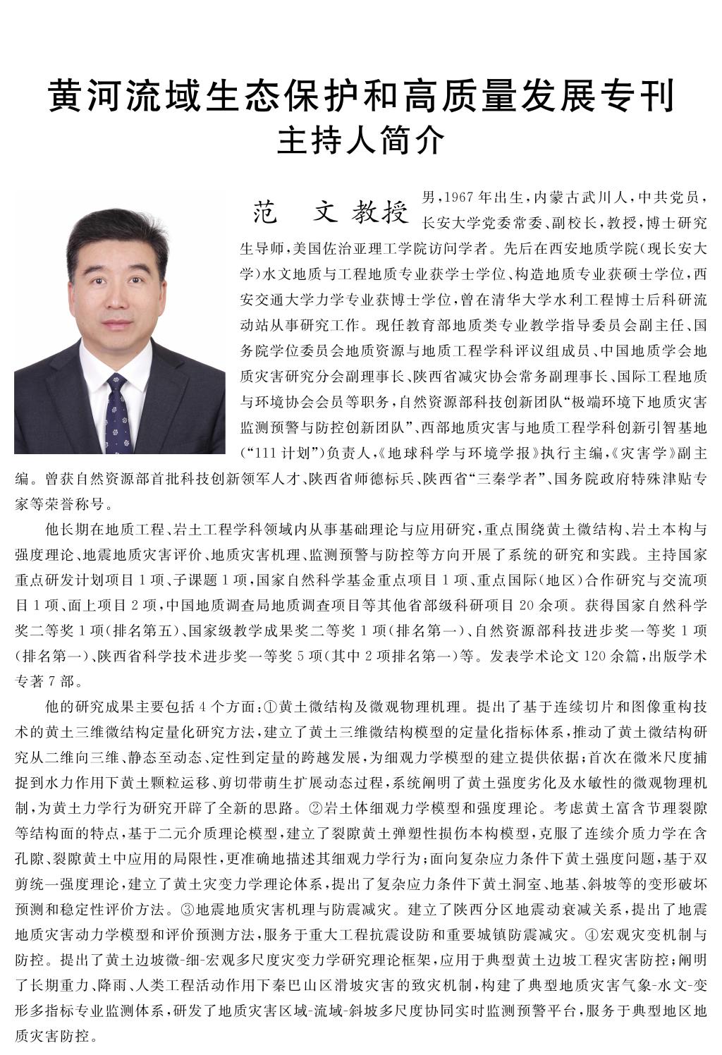本专刊围绕黄河流域复杂地质地表过程、生态环境效应与人地协调、资源型城市绿色转型发展等方面的科学问题开展了广泛报道,分上、下两册(2025年第3期和第4期)共出版38篇高质量论文。其中,范文教授作为专刊主持人,以一作身份发表了题为“极端降雨下黄土体灾变机制与滑坡风险防控”的高质量论文。91麻豆