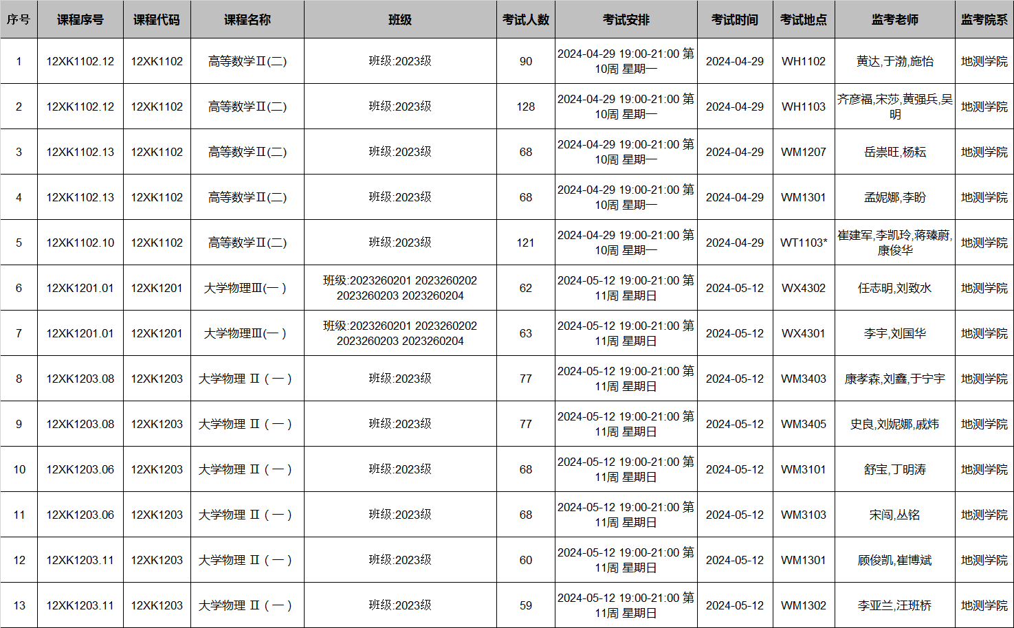 2023-2024-2学期高等数学、大学物理期中考试安排已发布,监考安排学院已经在本科教务系统中填报完成(监考教师可同时在本科教务系统中查看监考安排)。为确保考试平稳顺利进行,学院已将相关监考工作安排表格上传到附件中,请各位老师及时下载查阅,并按时完成监考工作。
