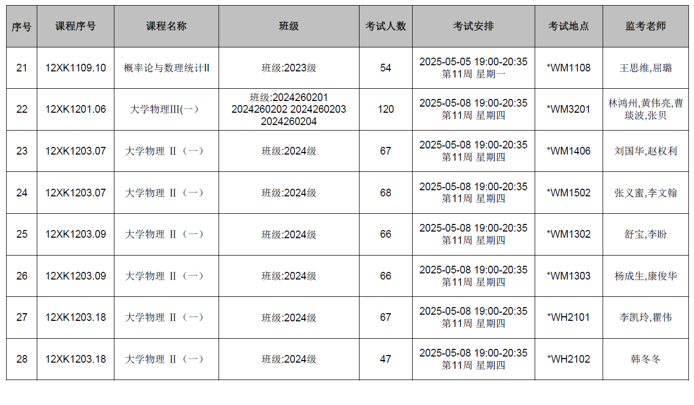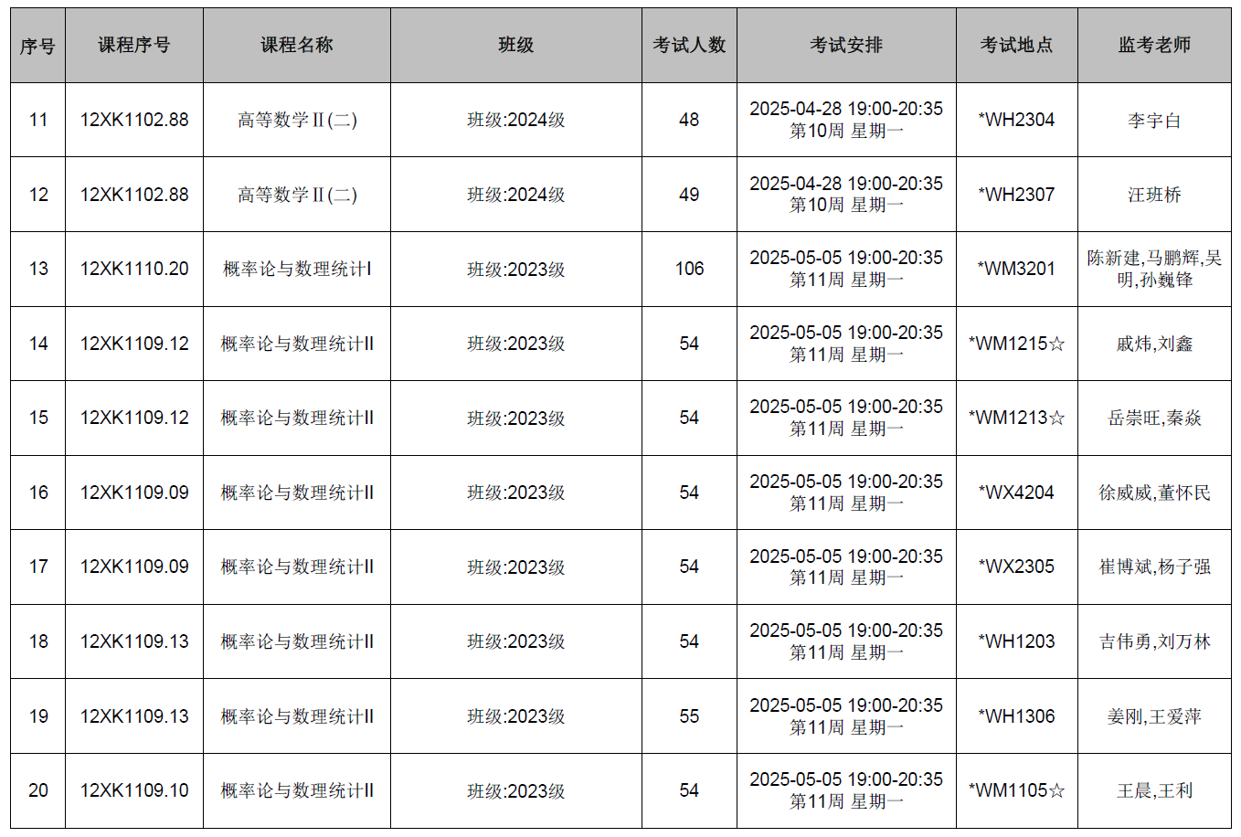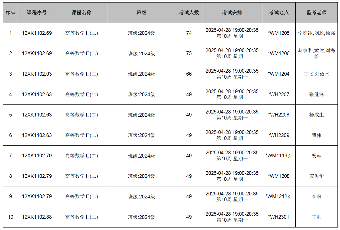 2024-2025-2学期高等数学、概率论与数理统计、大学物理期中考试安排已发布,监考安排学院已经在本科教务系统中填报完成(监考教师可同时在本科教务系统中查看监考安排)。为确保考试平稳顺利进行,学院已将相关监考工作安排表上传到附件中,请各位老师及时下载查阅,并按时完成监考工作。